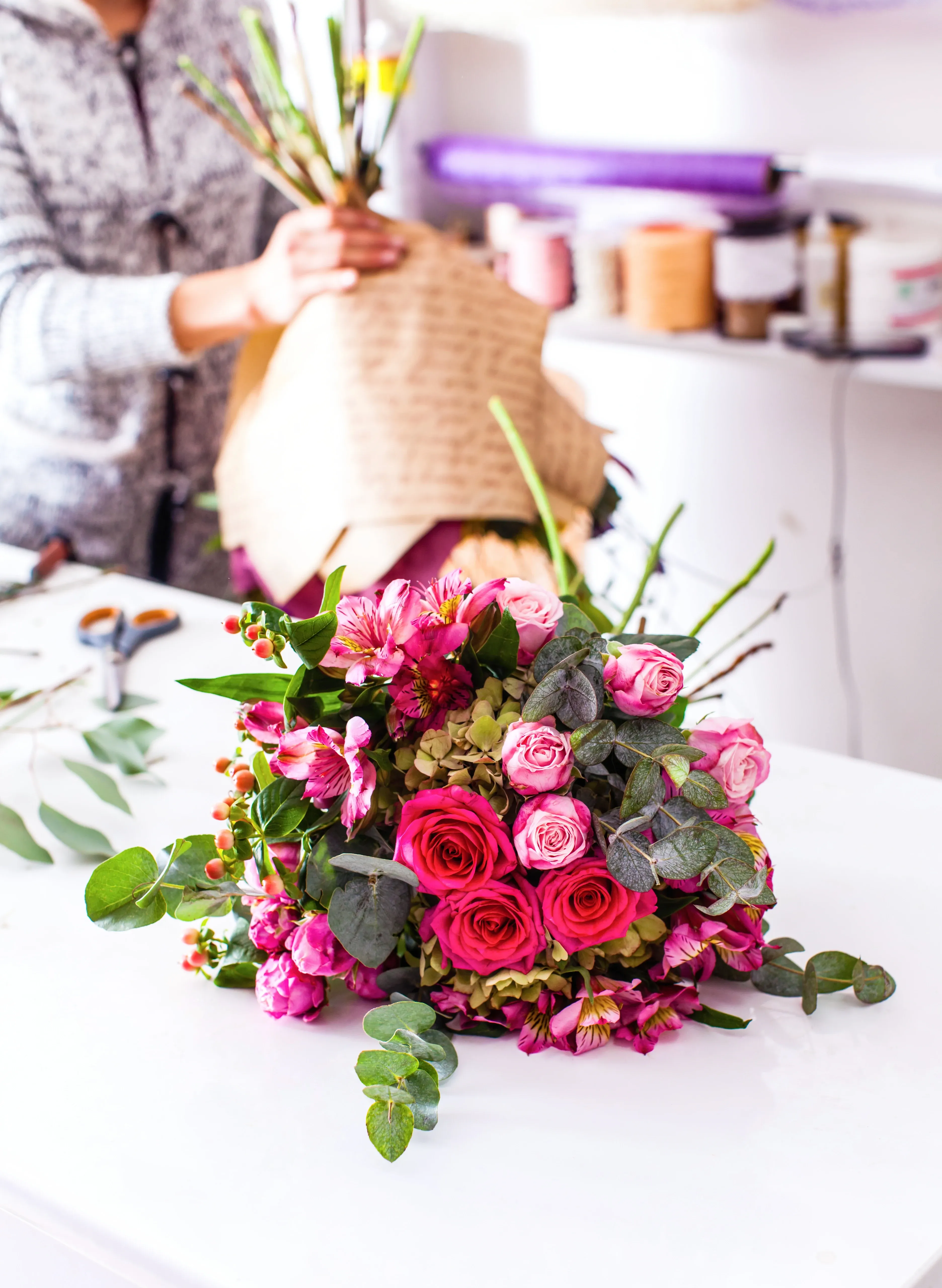 Курьер компании заберет готовый заказ со склада и отвезет его по адресу. Заказчику будет отправлено фото получателя с букетом.